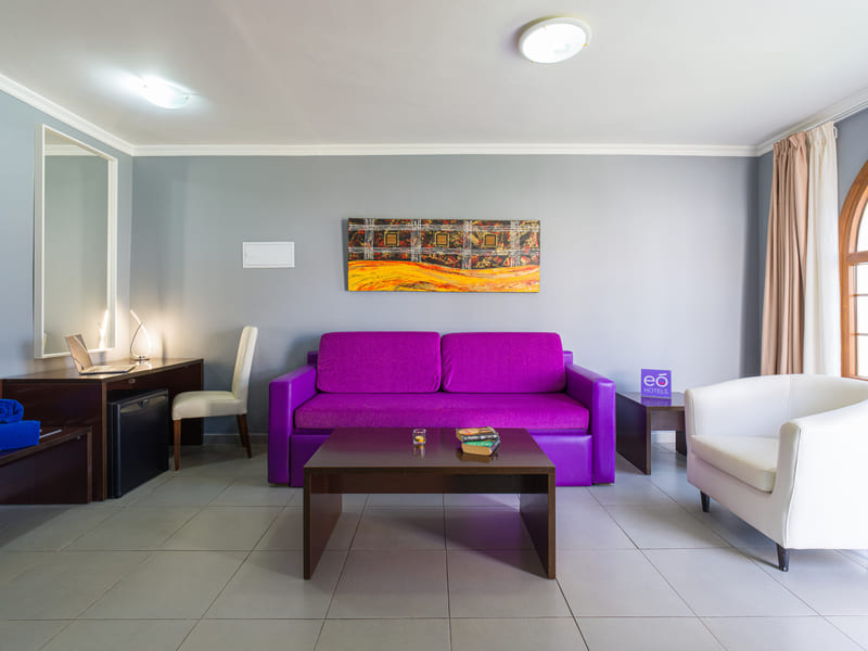 eó Suite Hotel Jardín Dorado is located in the golf course of Maspalomas, near the dunes of sand. It offers outdoor swimming pool and luxury junior suites with private garden, it has a small gymnasium, a sauna and, in winter, a heated swimming pool with hydro massage that includes jets and whirl-bath. As well as massages can be reserved on request. The hotel is located 20 minutes walk from the centre of Maspalomas and 2,5 km from the beach, we offer one service of free transport to the beach of Maspalomas and to Playa del Inglés.