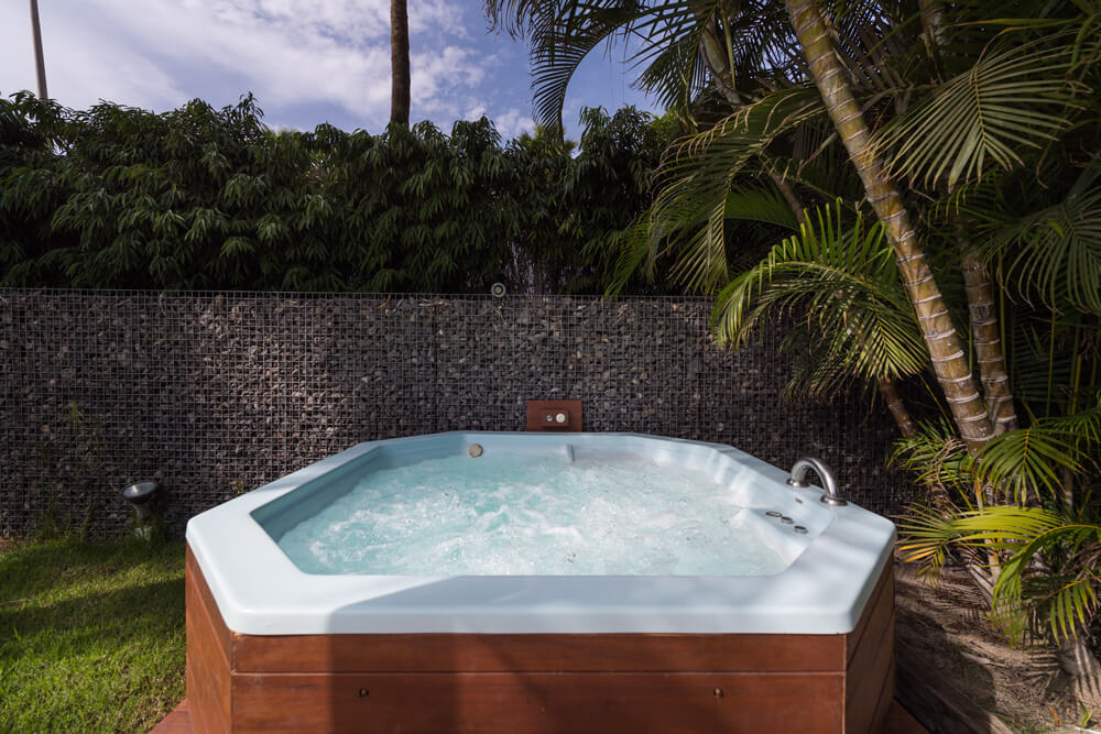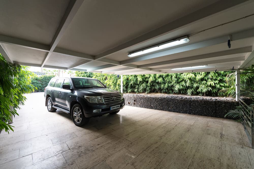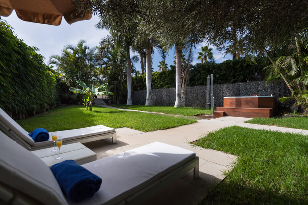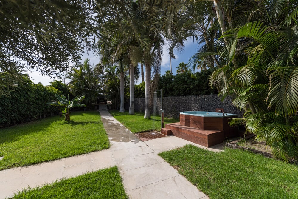 En el jardín con césped natural encontrarás varias hamacas de gran confort, una ducha refrescante y un jacuzzi de excelente tamaño con espacio para hasta 6 personas. Tus vehículos quedarán dentro de la propiedad ya que la villa posee aparcamiento propio.