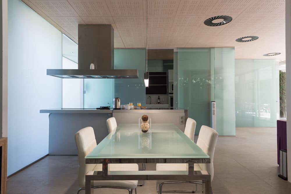 El comedor además de los 2 sofás cama posee una gran TV plana de 55 pulgadas, mesa comedor para hasta 6 comensales que se puede ampliar hasta 12 con la mesa exterior, el aire acondicionado hará que las veladas en esta estancia sean aún más agradables.